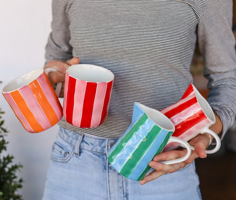 Shop mugs2. Shop pink and yellow stripe Noss mugs